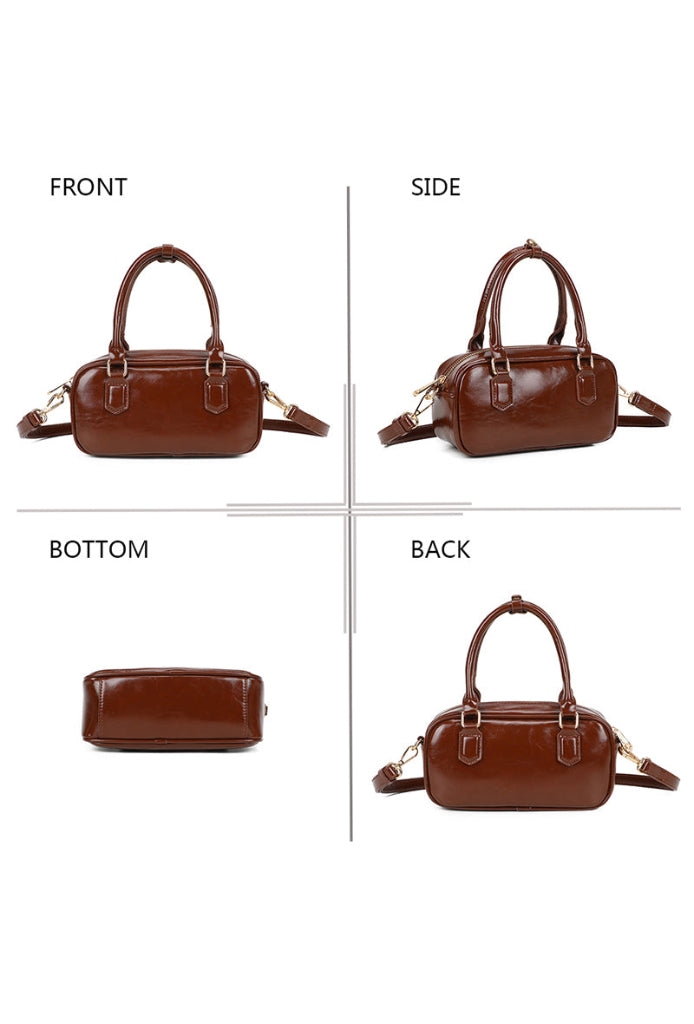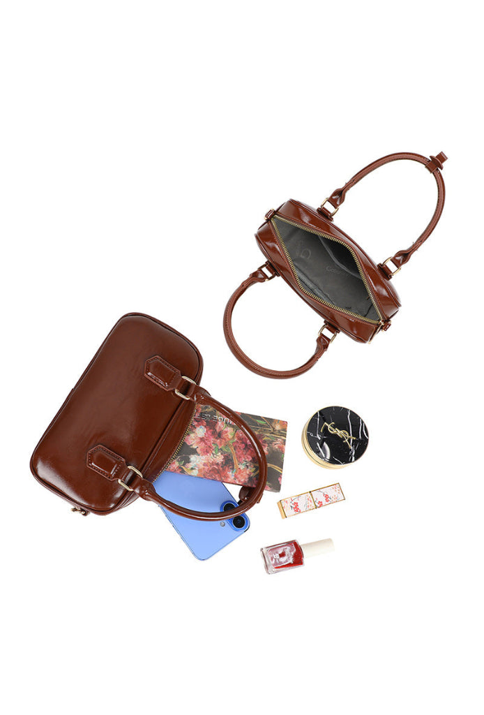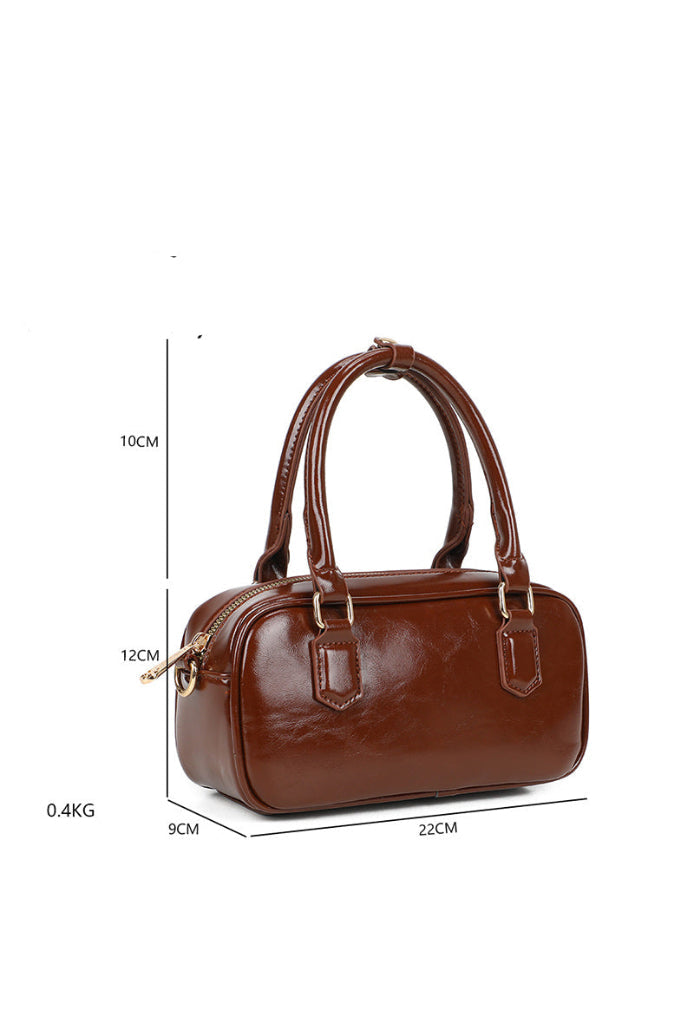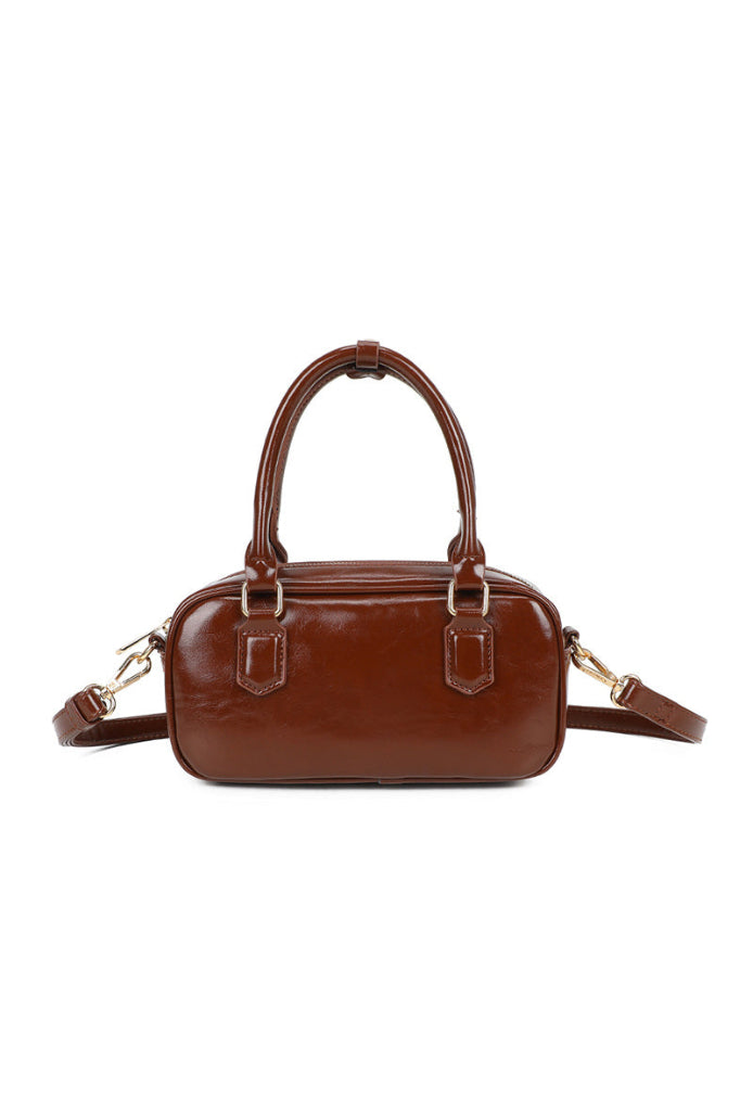 Ruskea olkalaukku.