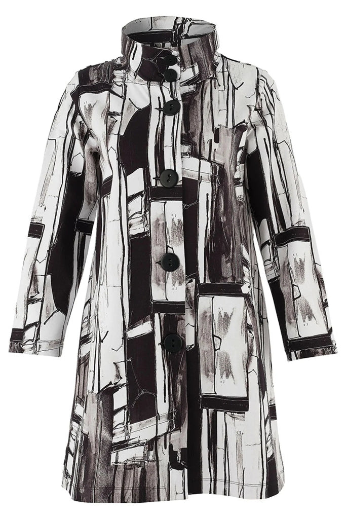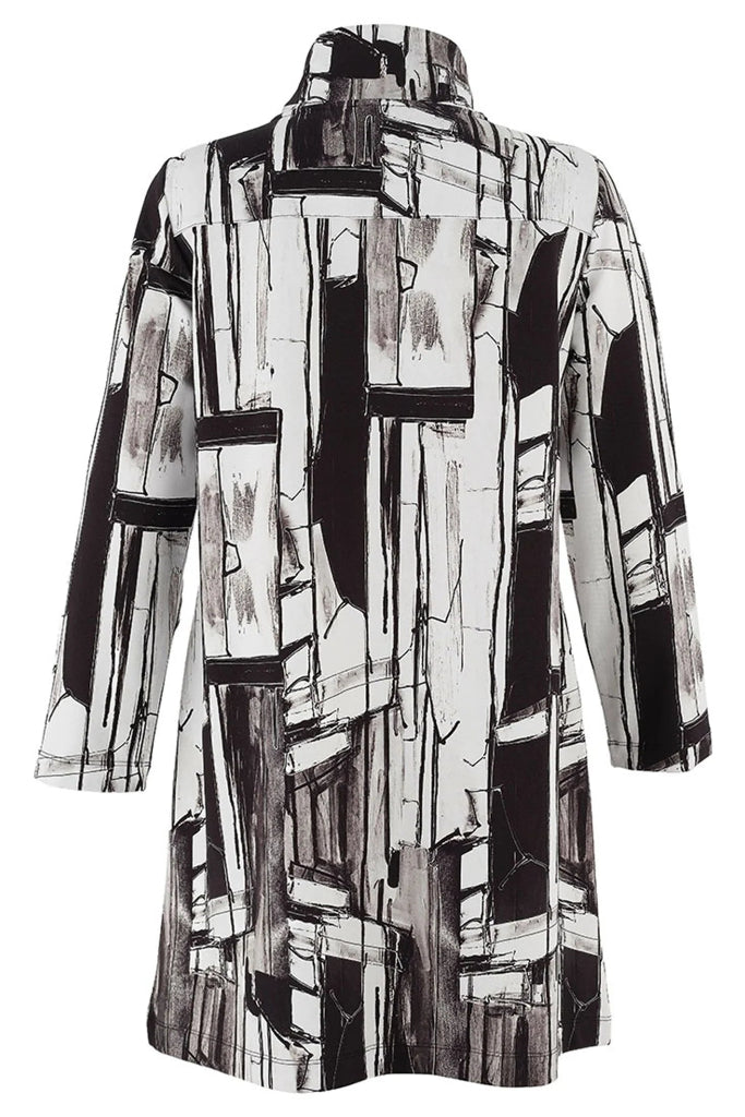 strukturoitu, puolipitkä takki rohkealla abstraktilla kuviolla ja