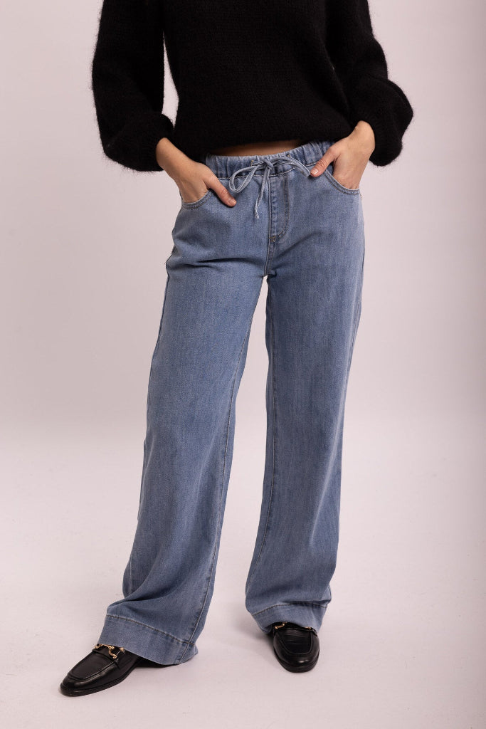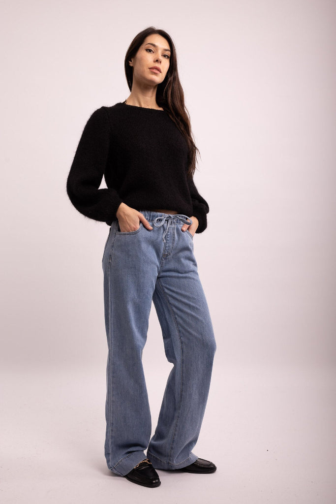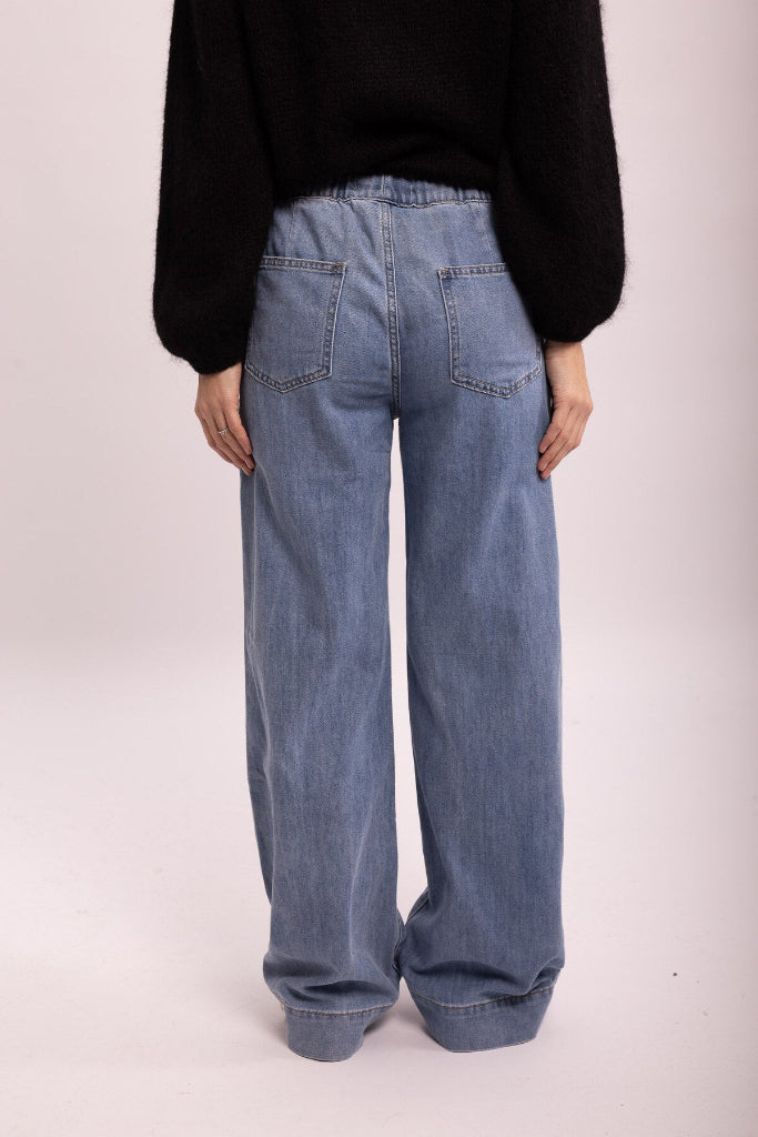 Ohut, mukavan joustava farkku. Leveä lahja, lahkeen suu 54cm. Etu- ja takataskut. Vyötäröllä kiristettävä nyöri. ( ei vetoketjua, eikä nappia).