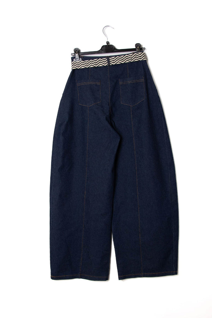 Tynnyrifarkut, barrel jeans. Tumman sininen denim on pehmeä, mukavan joustavaa. Korkea vyötärö, istuva malli, leveä lahje pyöristyy alaspäin. Munaan tulee koristevyö. Super chic!