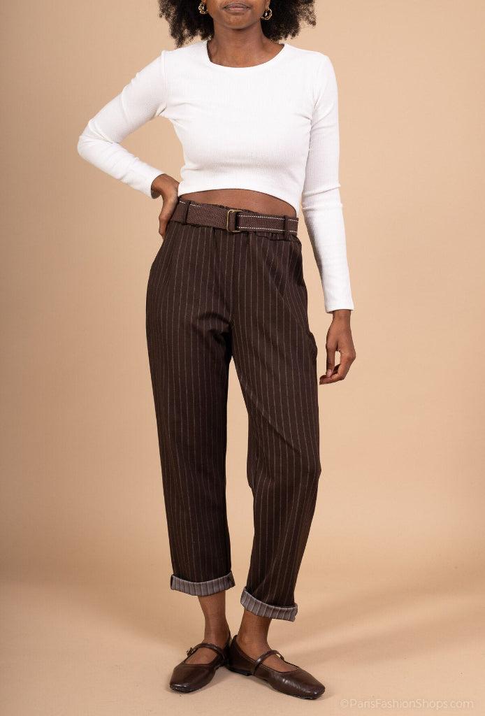 Kapeahko, mutta suoralinjainen pehmeä housu. Hento raitakuosi. Täyspitkä pituus mutta voit keventää käärimällä lahjetta. Kuminauhavyötärö, koristevyö tulee housun mukana. Taskut. Joustava!