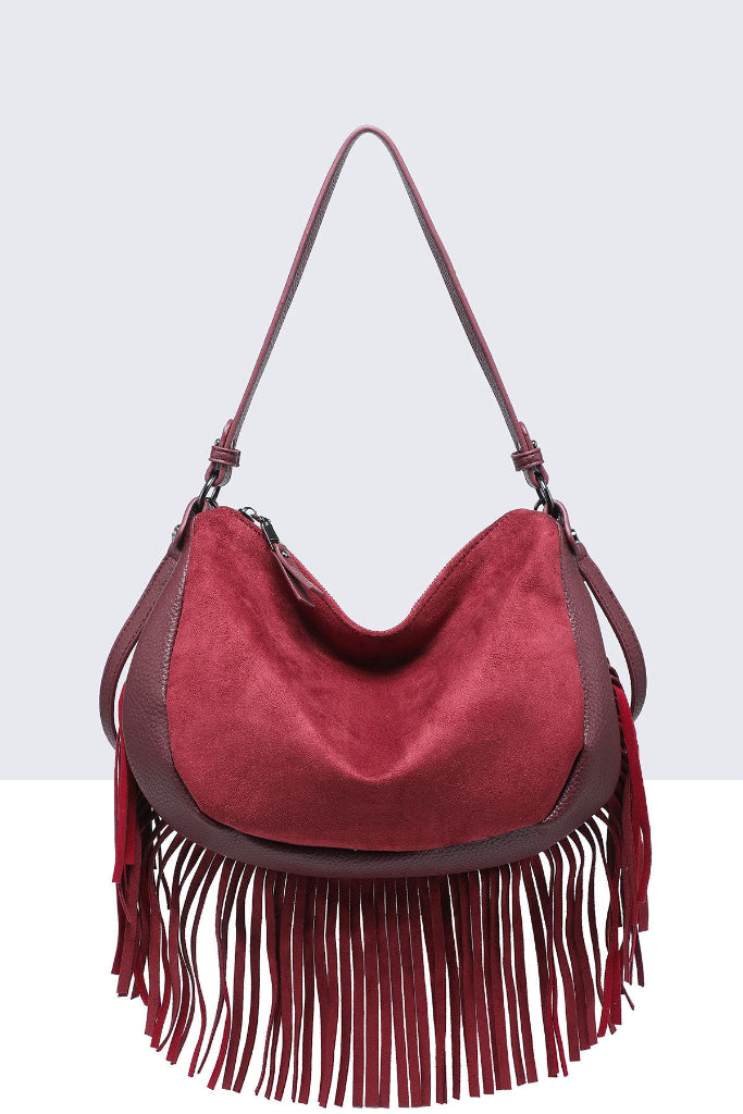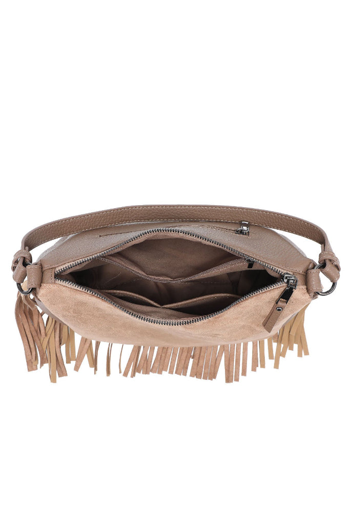 Tekonupukkinahkainen olkalaukku hapsuilla