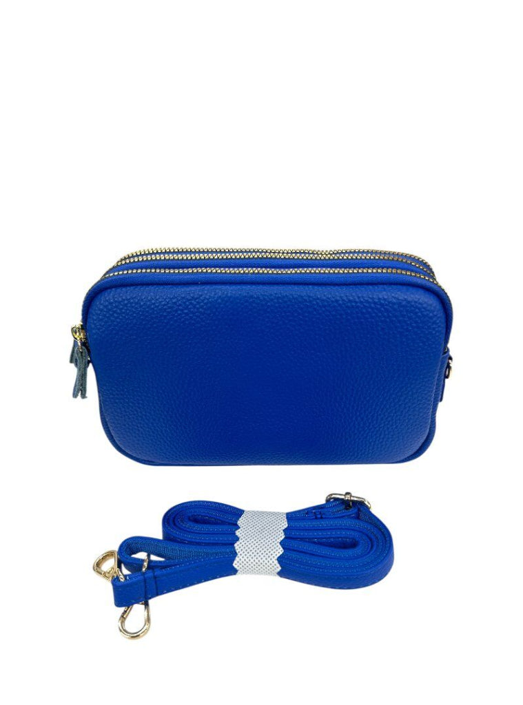 Pieni olkalaukku kolmella vetoketjutaskulla. Kullan väriset vetoketjut. Lehmännahkaisessa laukussa irrotettava pitkä olkahihna.