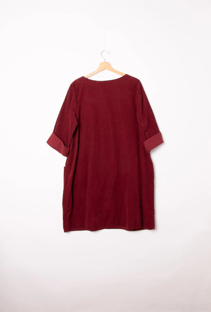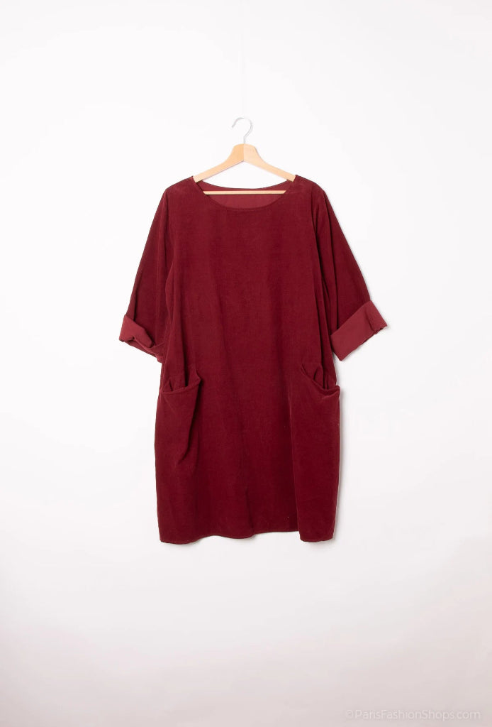 Sirolinjainen, yksivärinen Esther samettimekko. Pyöreä pääntie ja 2/3 hihat. Mekon edessä taskut. Ohut, mukava vakosametti. Toimii myös tunikana.