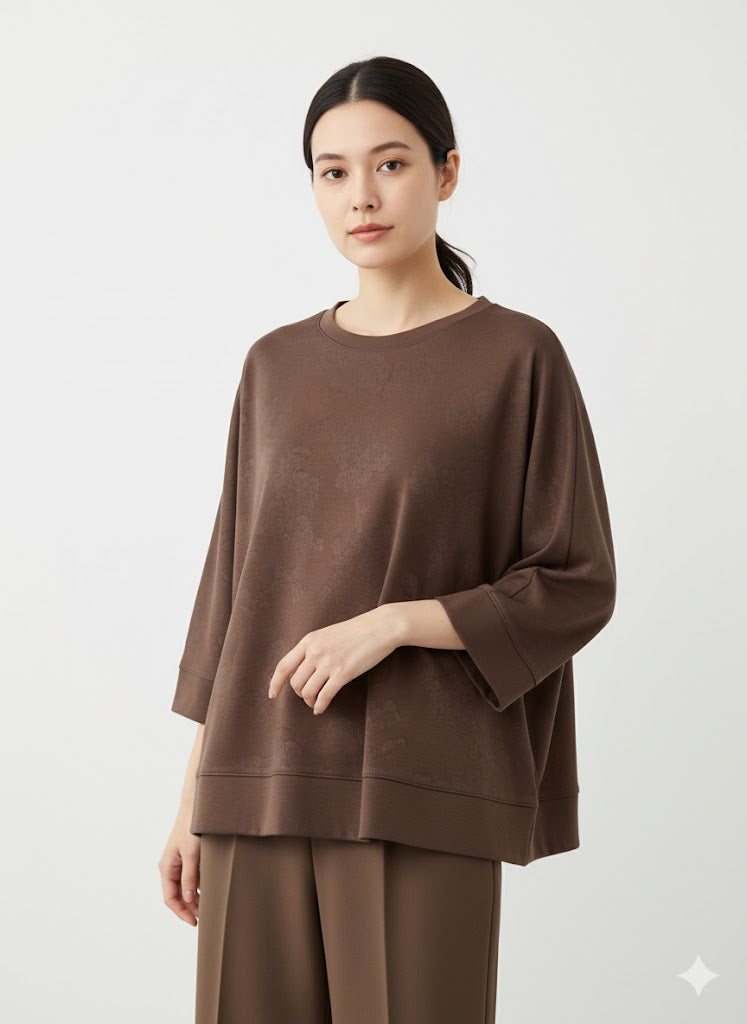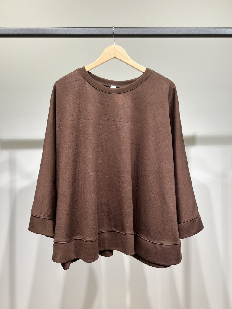 A-linjainen ruskea pusero. Pyöreä pääntie, edessä hento ruusukuvio.