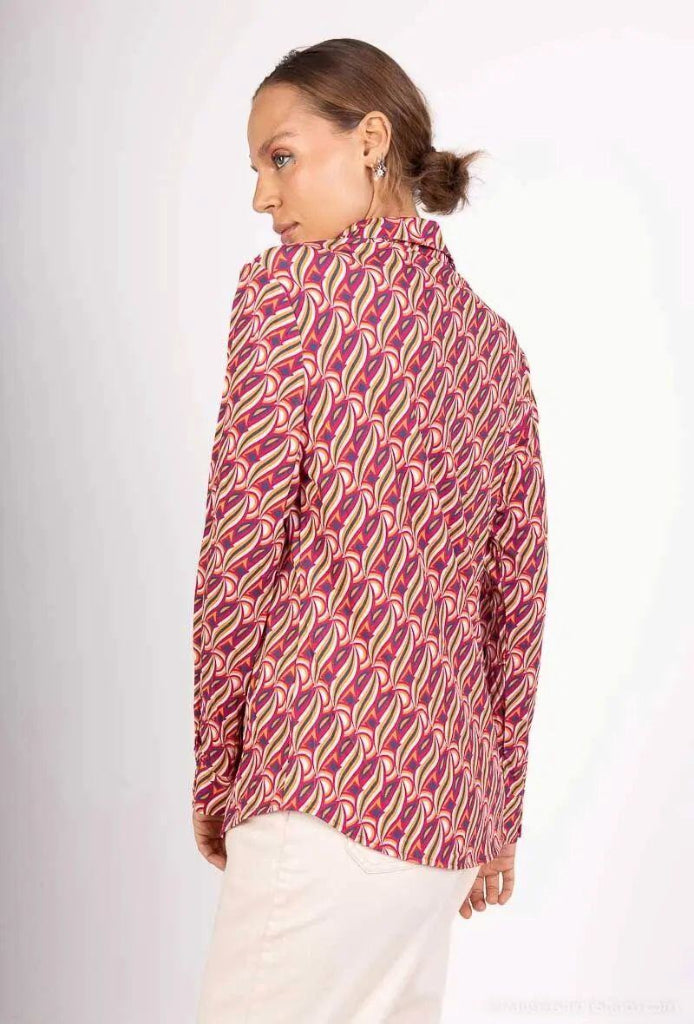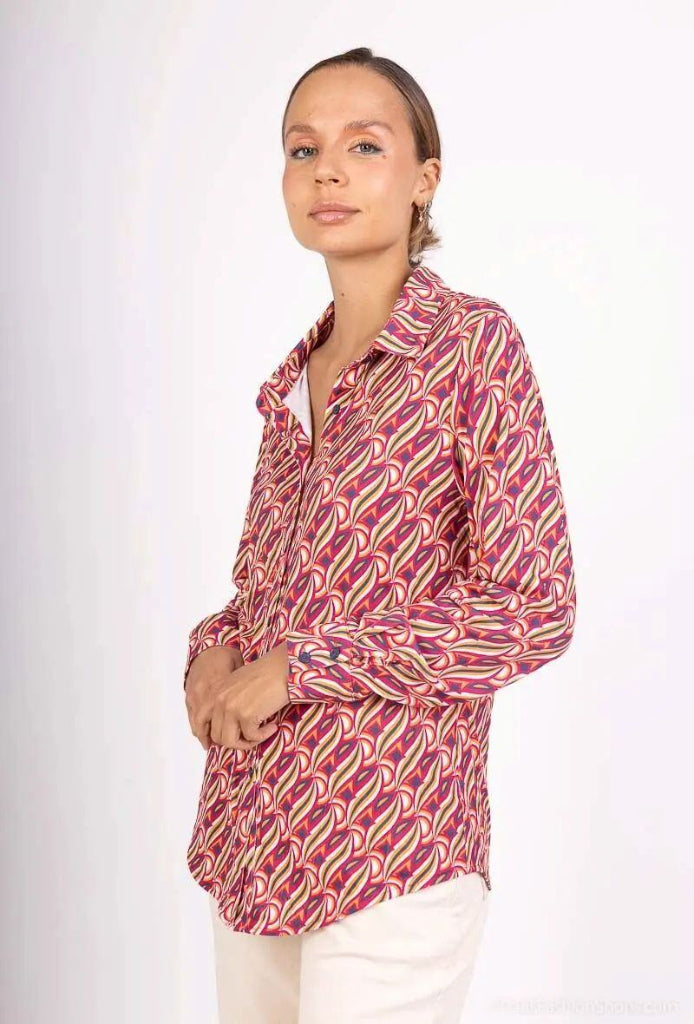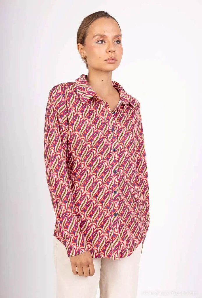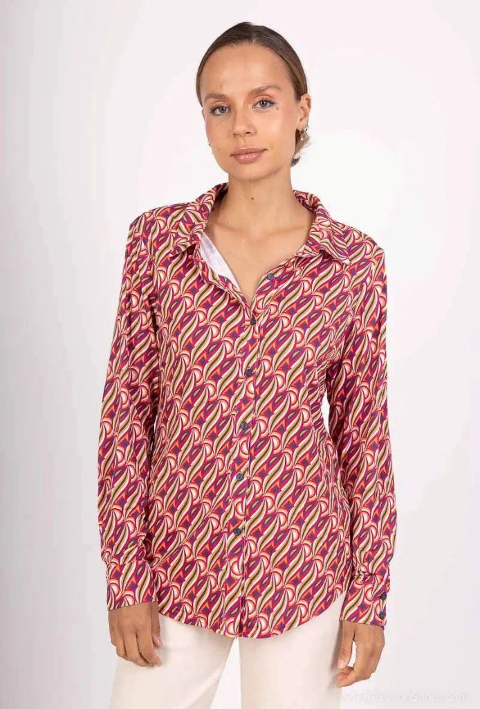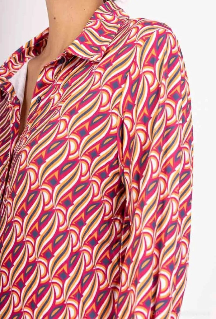 Raikas! Joustava, mukava, napakka paitapusero. Punaista, oranssia vaalea ja tumman sinistä. Pyöristetty helma. Helppohoitoinen: Pese ja pidä!