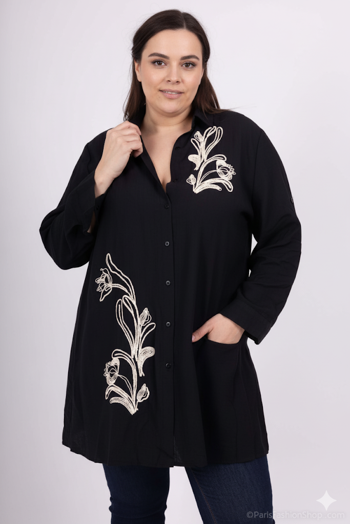 Musta tunika, tai pitkä A-linjainen paitapusero. Edessä beige kirjailu.