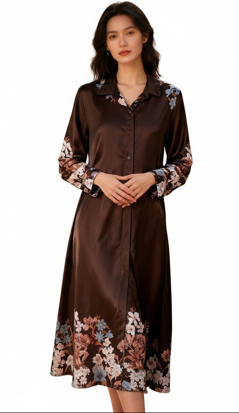 Kiiltävästä kankaasta valmistettu A-linjainen paitamekko, jossa on kukkakuvio.