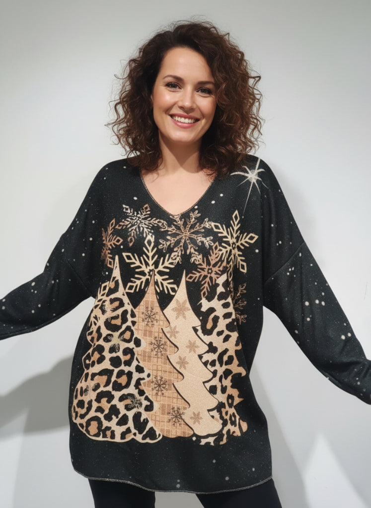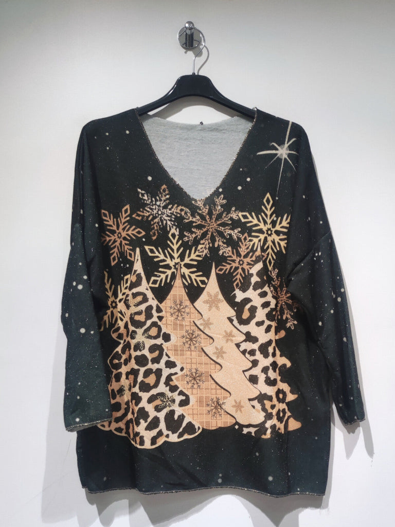 Ohut neulospusero, väljä malli, syvä V-aukko.  Kuusimetsä kuvio, edessä ja takana sama printti..
