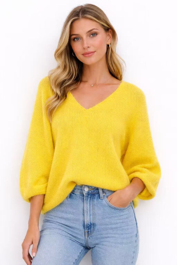 Ihanan pehmeä neule. Joellen neule on valmistettu pehmeän pörröisestä alpakkasekoitteesta. V-pääntie, Raglanhiha.