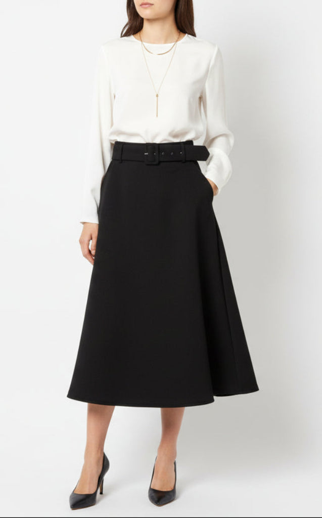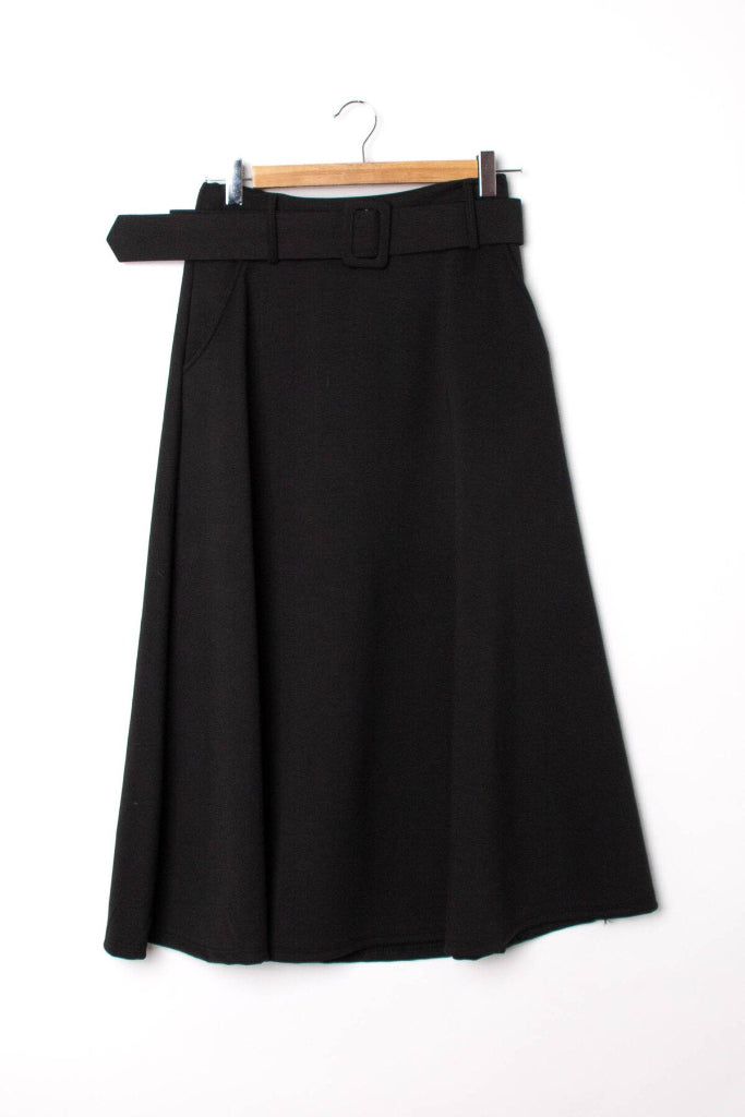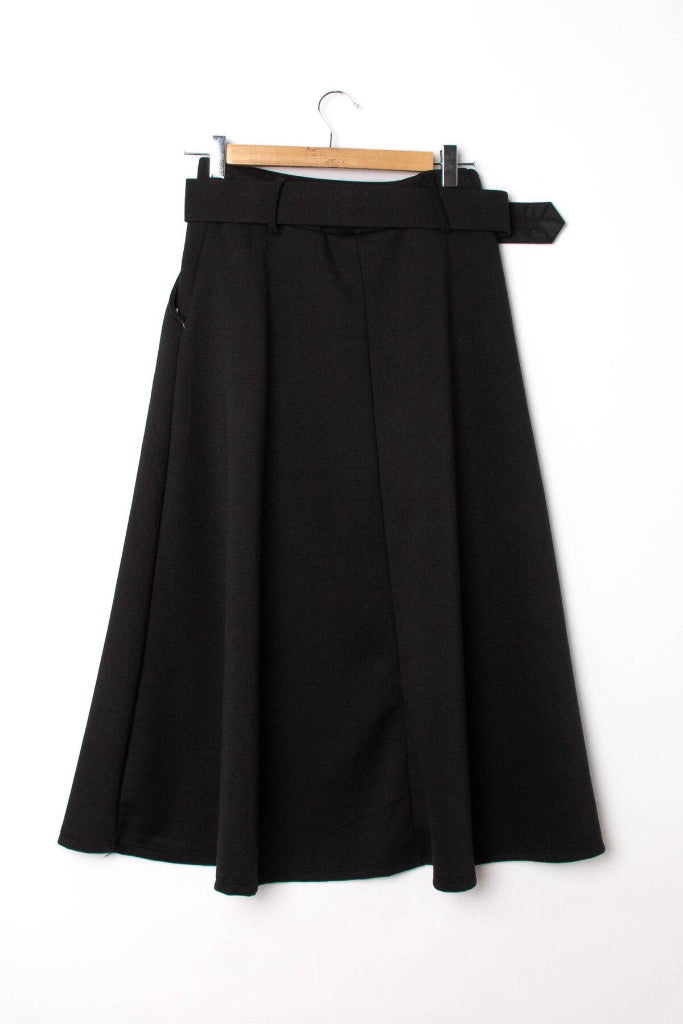 Kauniisti laskeutuva midipituinen hame. Superpehmeä kangas! Kuminauhavyötärö, taskut.