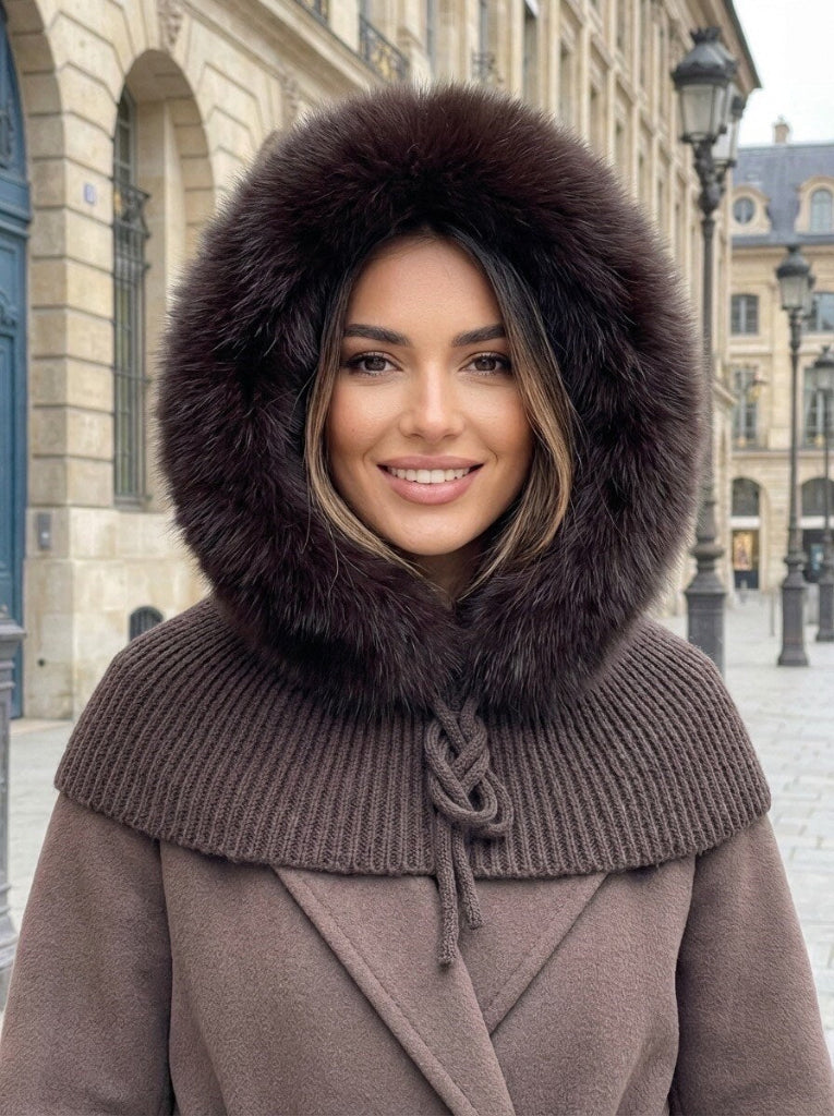 Huppu, josta saa näyttävän kauluksen myös. Ihanan pehmeä tekokarva ympyröi kasvot.