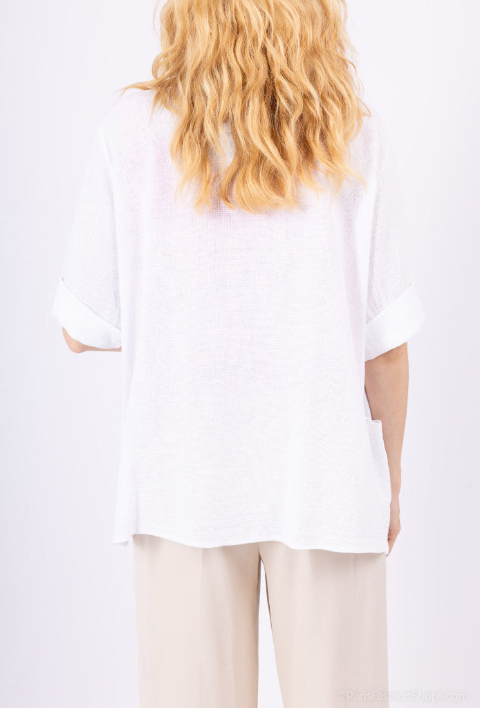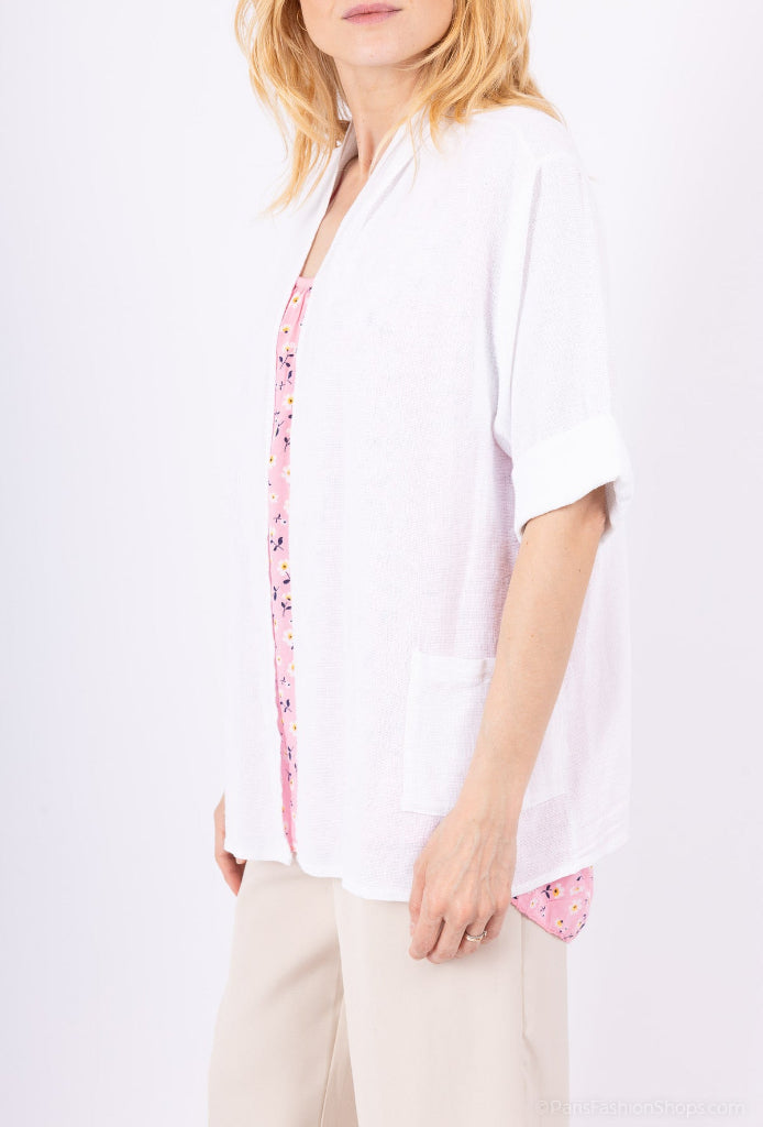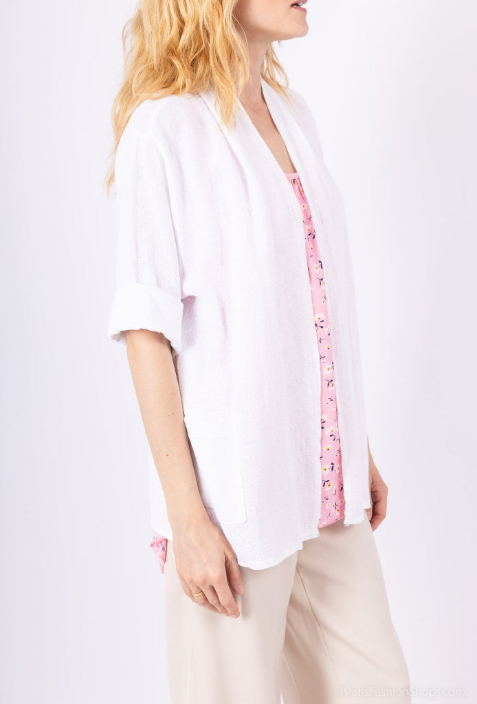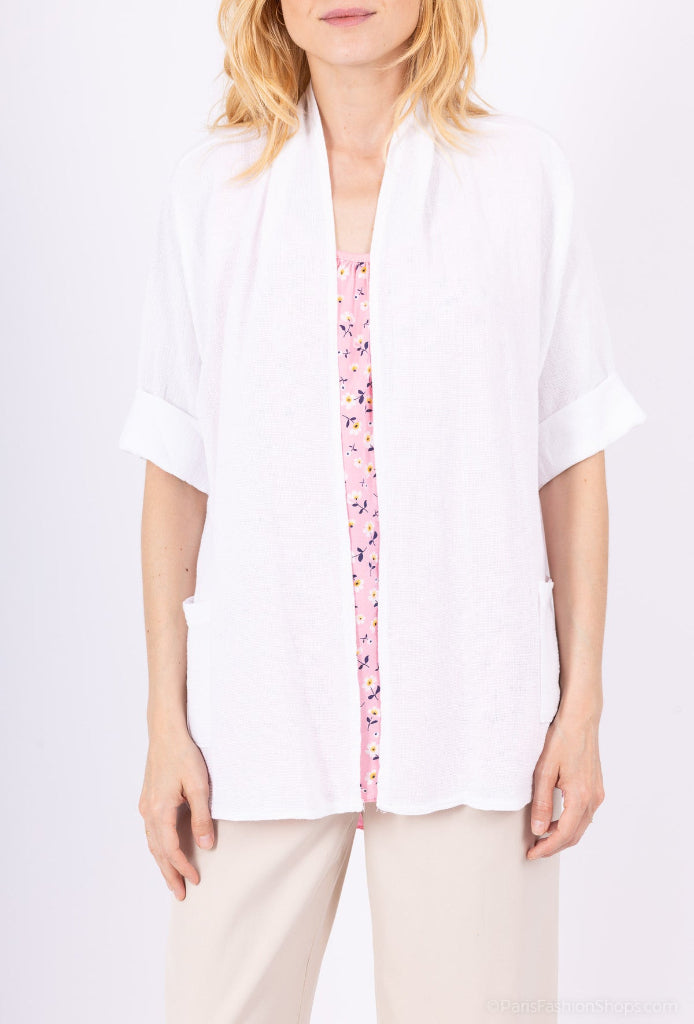 Ohut, rento yhden koon auki pidettävä jakku, edessä taskut. Vuoriton.