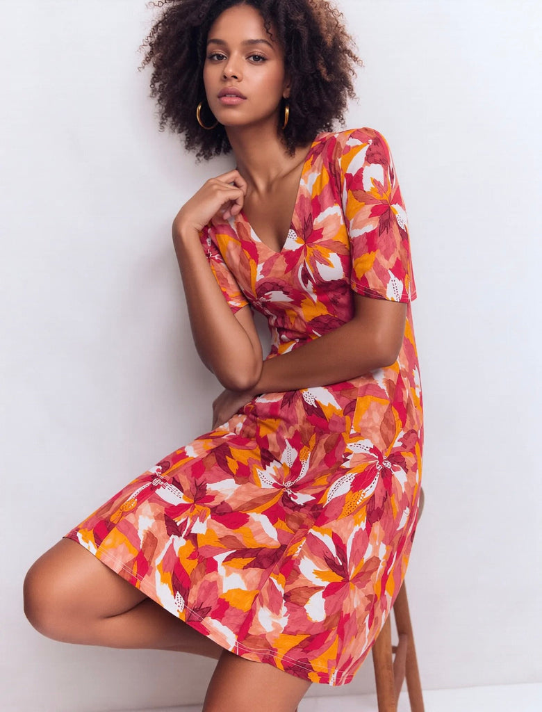 Oranssipunainen, A-helmainen mekko Zara Pariisista.  Susanne