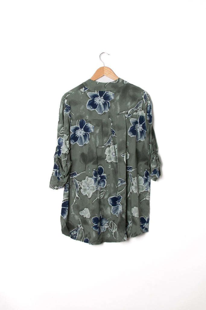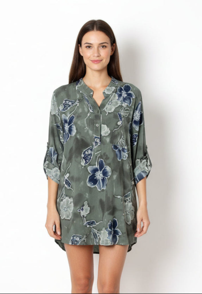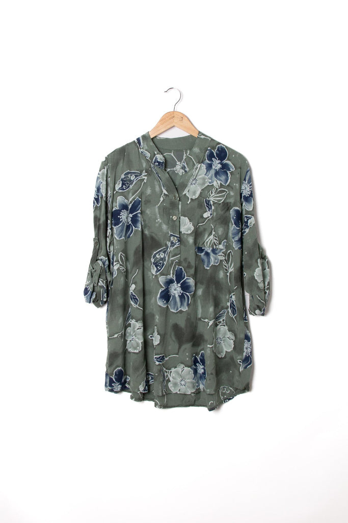 Laskeutuva paitis Italiasta. 2/3 hihan voi "tiputtaa" myös täyspitkäksi. Kuviona kukat, kaula-aukossa 3 avattavaa nappia (puetaan pään yli). Rintatasku. Pyöristetty helma, pystykaulus. Yhden koon paita on n. 36-44 suomen kokoa.