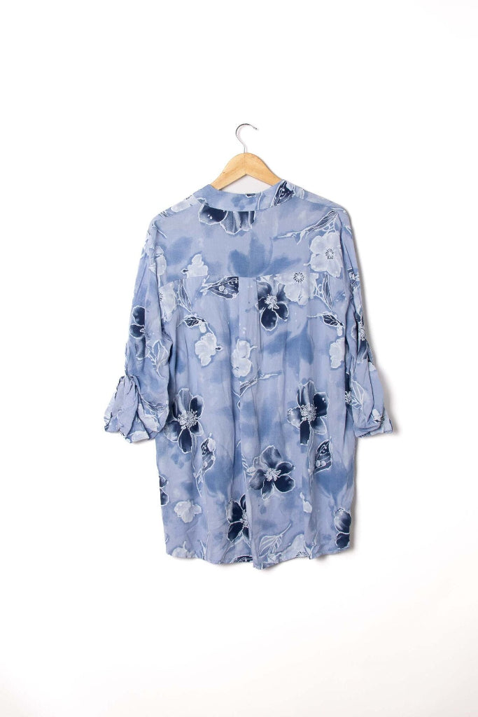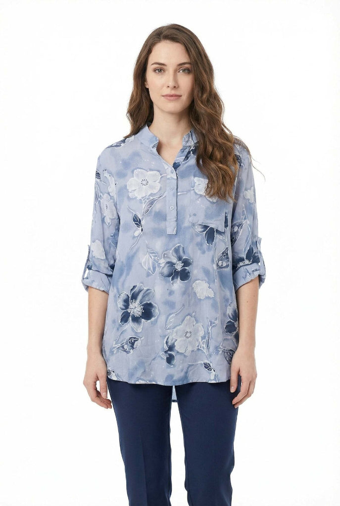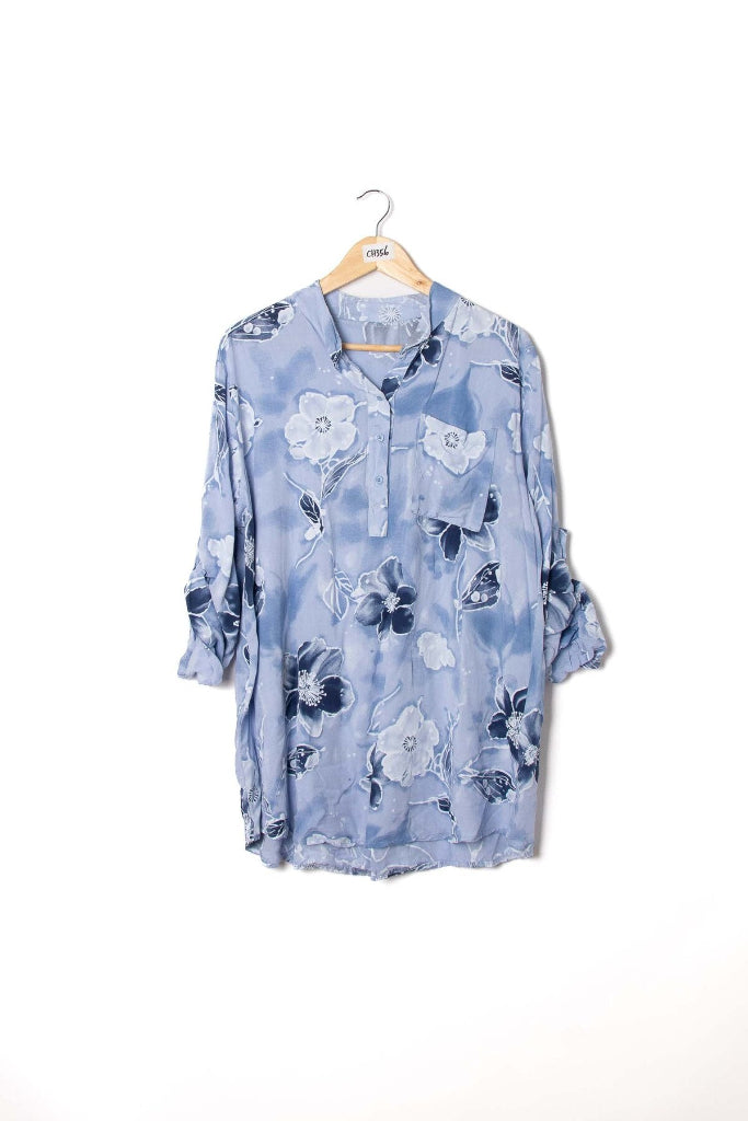 Laskeutuva paitis Italiasta. 2/3 hihan voi "tiputtaa" myös täyspitkäksi. Kuviona kukat, kaula-aukossa 3 avattavaa nappia (puetaan pään yli). Rintatasku. Pyöristetty helma. Yhden koon paita on n. 36-44 suomen kokoa.